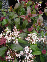 A bushy evergreen shrub with lustrous dark green leaves which emerge a lovely burgundy-red. Pink-budded clusters of lightly fragrant flowers open to white. They flower all through winter and spring. The flowers are followed by metallic blue-black fruits. It is an excellent plant for creening and hedging, very hardy to many situations, though avoid very dry soil.